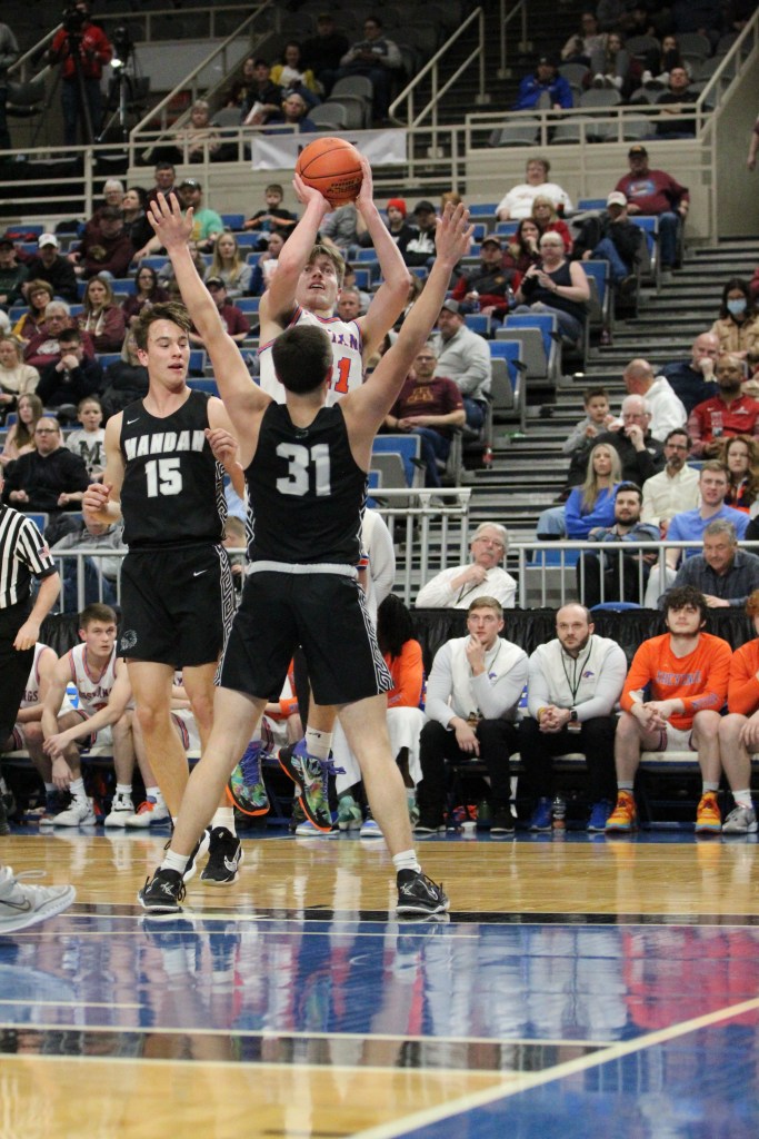 West Fargo Sheyenne took on Minot in the first boys semifinal game on the evening of Friday, March 11, 2022. The Mustangs were up 19-11 before the Magicians made a late first half comeback to go up by one at halftime, 24-23.